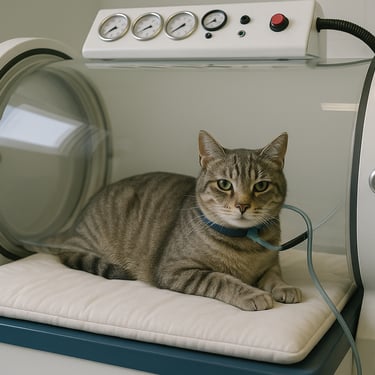 La oxigenoterapia hiperbárica (OHB) es un tratamiento en el que el animal se introduce en una cámara cerrada donde se le suministra oxígeno puro o concentrado a una presión superior a la atmosférica (normalmente 1,4 ATA). Esta presión elevada permite que el oxígeno se disuelva en el plasma sanguíneo y llegue a tejidos dañados o mal irrigados, acelerando significativamente la recuperación.